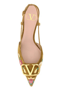 Slingback realized in suede characterized by floral embroideries on the entire surface enriched by VLogo Signature metal detail on the instep. - Adjustable ankle strap closure - Pointed toe - Printed logo on the inside - Italian heel DETAILS Camel suede VLogo Signature pumps Exterior: 100% Suede Interior: 100% Leather Sole: Leather Made in italy Heel height: 8 cm