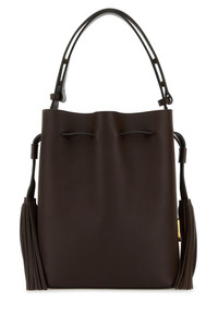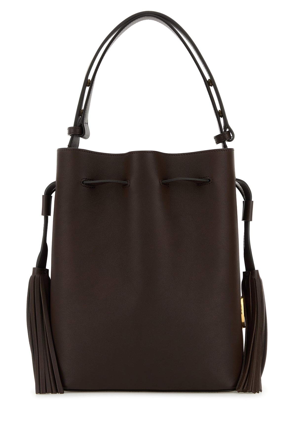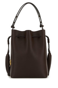 Bucket bag realized in pebble leather enriched by VLogo Signature metal detail on the side. - Adjustable tonal leather handle - Drawstring closure - Decorative tassels on the sides - Lined DETAILS Chocolate leather VLogo Signature bucket bag Exterior: 100% Leather Lining: 100% Suede Finishing: Antiqued golden metal Made in italy Width: 23 cm Height: 27 cm Depth: 14 cm Min handle height: 15 cm Max handle height: 25 cm