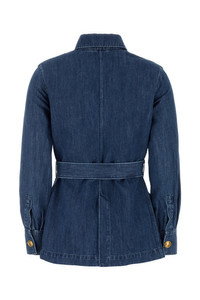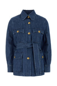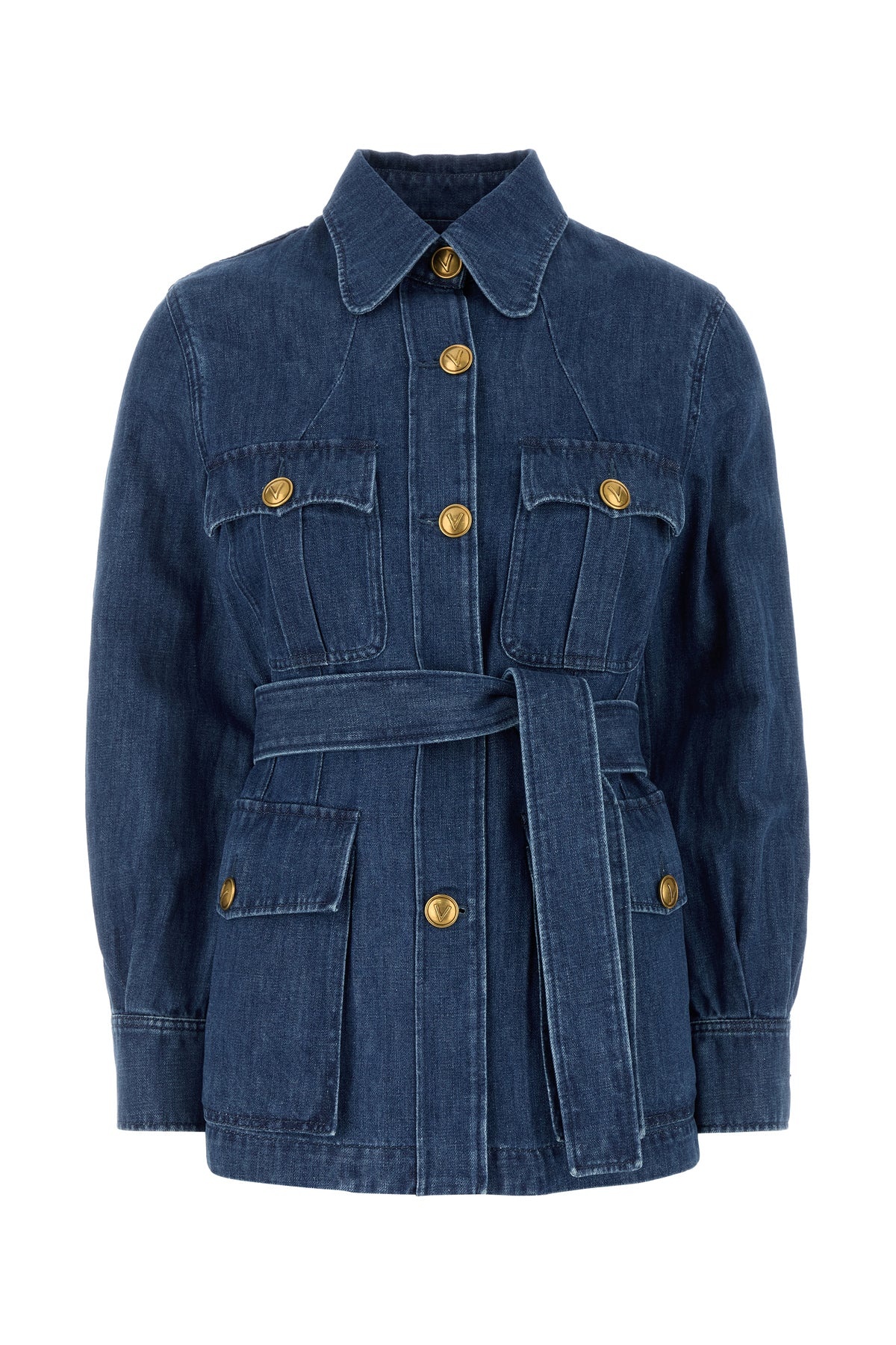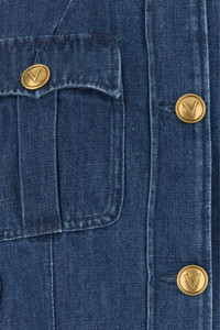 Blazer realized in cotton and linen denim enriched by metal V-Gold buttons and detachable belt to tie at the waist. - Pointed collar - Buttons closure - Four flap pockets at the front - Belt loops at the waist - Buttoned cuffs - Central slit at the back - Unlined DETAILS Denim blazer Exterior: 64% Cotton 36% Linen Made in italy Sample size: 40