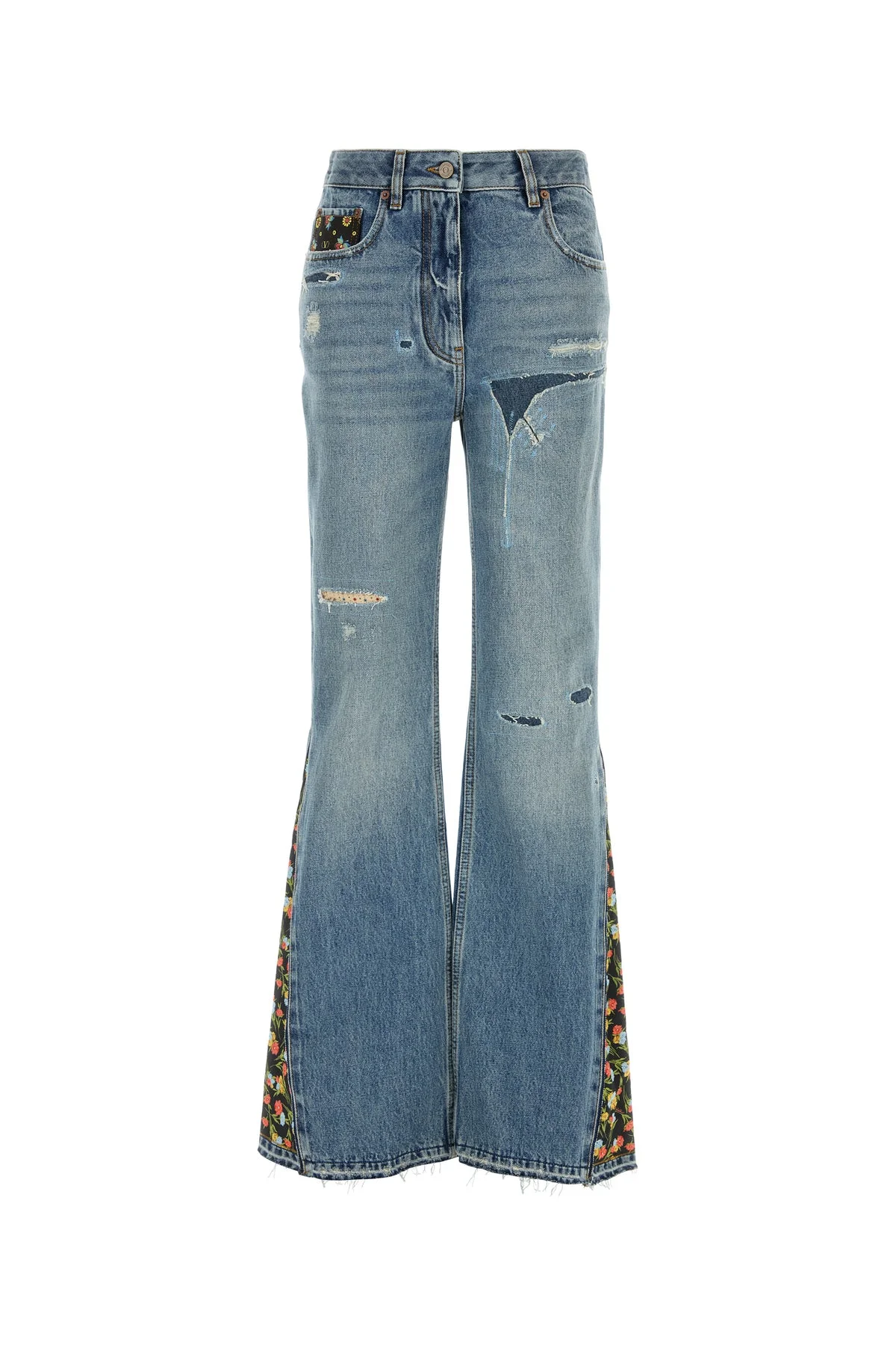 Flared leg jeans realized in stonewashed and distressed pure cotton denim with printed fabric inserts on the sides enriched by logoed label at the back. - Belt loops at the waist - Concealed zip and single visible button closure - Five classic pockets DETAILS Denim jeans Exterior: 100% Cotton Made in italy Sample size: 26