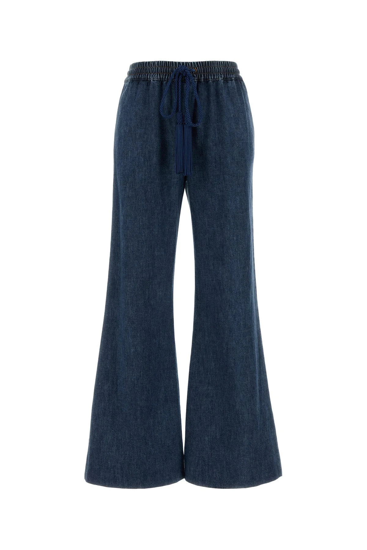 Flared jeans realized in pure cotton denim enriched by metal V Gold detail at the back. - Gathered elastic waist with drawstring and tassels - Seam pockets and two patch pockets at the back DETAILS Denim jeans Exterior: 100% Cotton Made in italy Sample size: 38