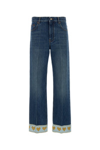 Jeans realized in slightly stonewashed pure cotton denim enriched by La Cour de Coeur motif fabric inserts on the hemline. - Belt loops at the waist - Concealed zip and a single visible button closure - Five classic pockets - Central ironed pleats - Logoed label at the back DETAILS Denim jeans Exterior: 100% Cotton Made in italy Sample size: 26