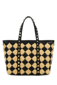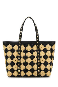 Shopping bag realized in woven raffia with leather trimmings characterized by checked motif embroidery on the entire surface enriched by metal studs at the front and at the back. - Two leather flat handles - Adjustable detachable leather shoulder strap - Magnetic button closure - Lined - Metal protective feet at the base DETAILS Embroidered raffia mini Rockstud handbag Exterior: 100% Raffia Lining: 1000% Fabric Finishing: Platinum Made in italy Width: 20 cm Height: 17,5 cm Depth: 8 cm Handle height: 11,5 cm Min shoulder strap length: 55 cm Max shoulder strap length: 60 cm