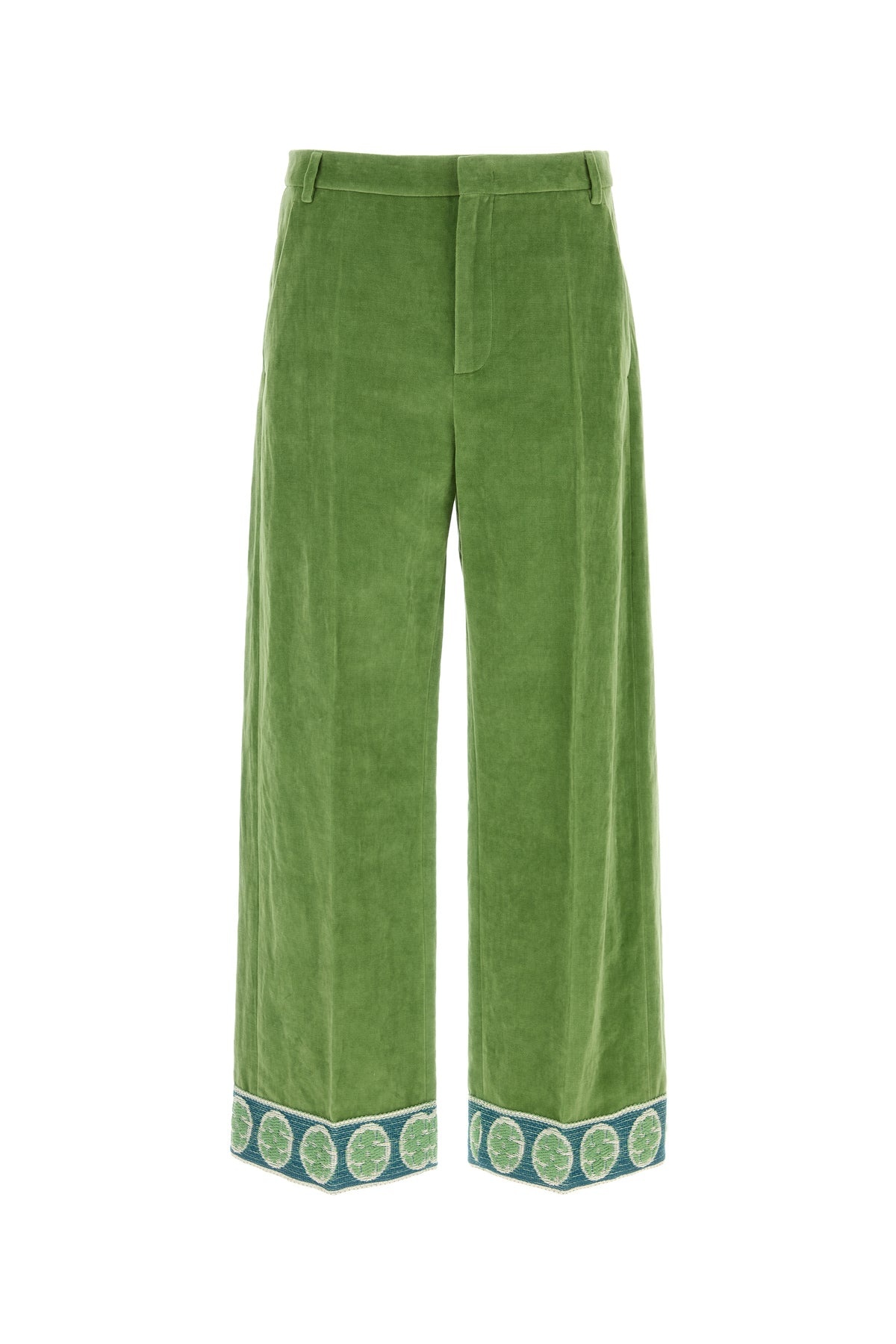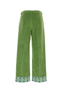 Pant realized in cotton and linen velvet characterized by peculiar embroideries on the hemline. - Belt loops at the waist - Concealed zip and hook closure - Slant pockets and two slit pockets at the back - Central ironed pleats DETAILS Green velvet pant Exterior: 55% Cotton 45% Linen Made in italy Model is 190 cm and is wearing a size 48