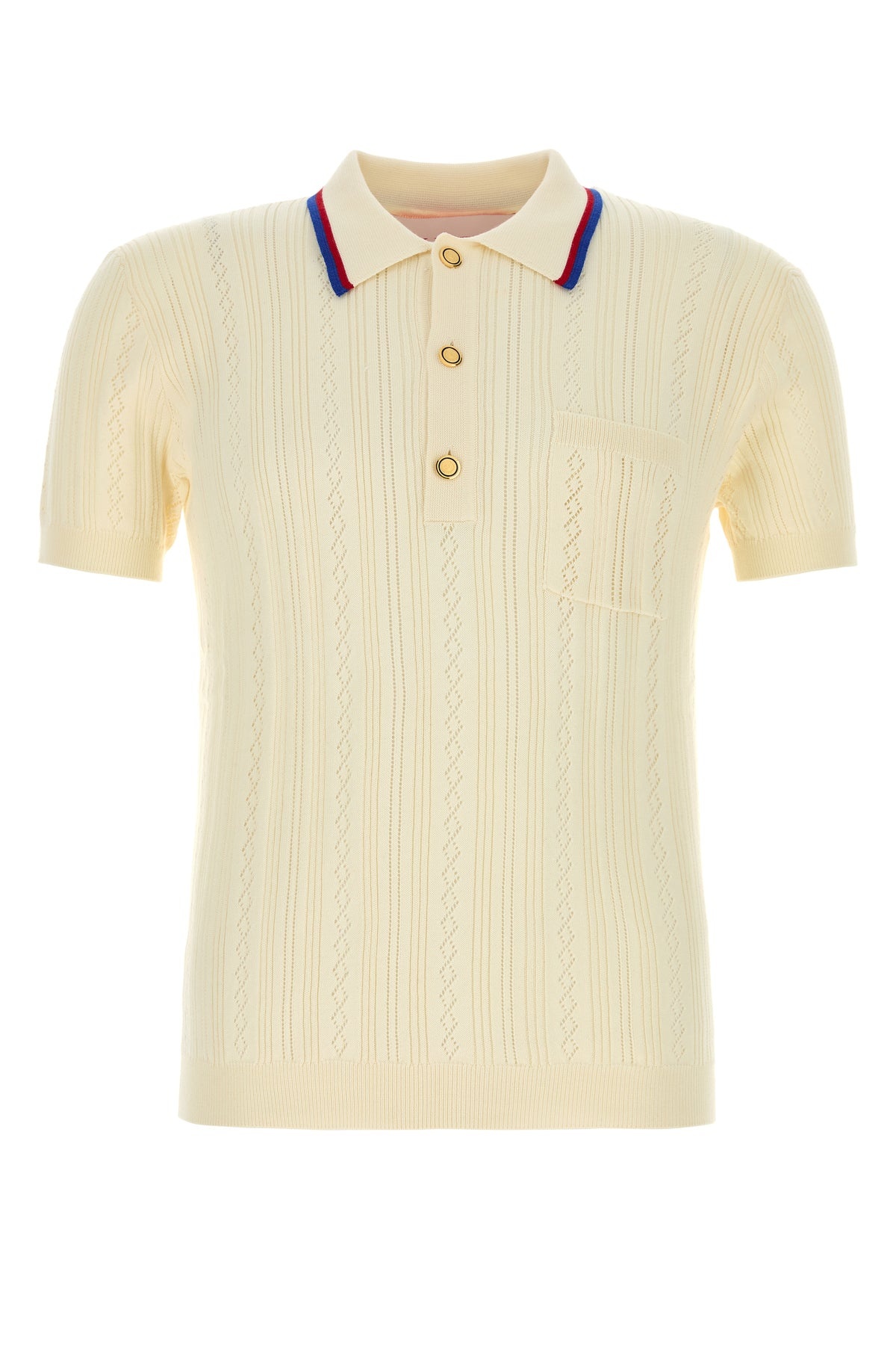 Knitted polo shirt realized in pure cotton characterized by peculiar perforated motif on the entire surface enriched by contrasting bands on the collar. - Pointed collar - Partial buttons closure at the front - Chest pocket - Ribbed cuffs and hemline DETAILS Ivory cotton polo shirt Exterior: 100% Cotton Made in italy Model is 190 cm and is wearing a size M