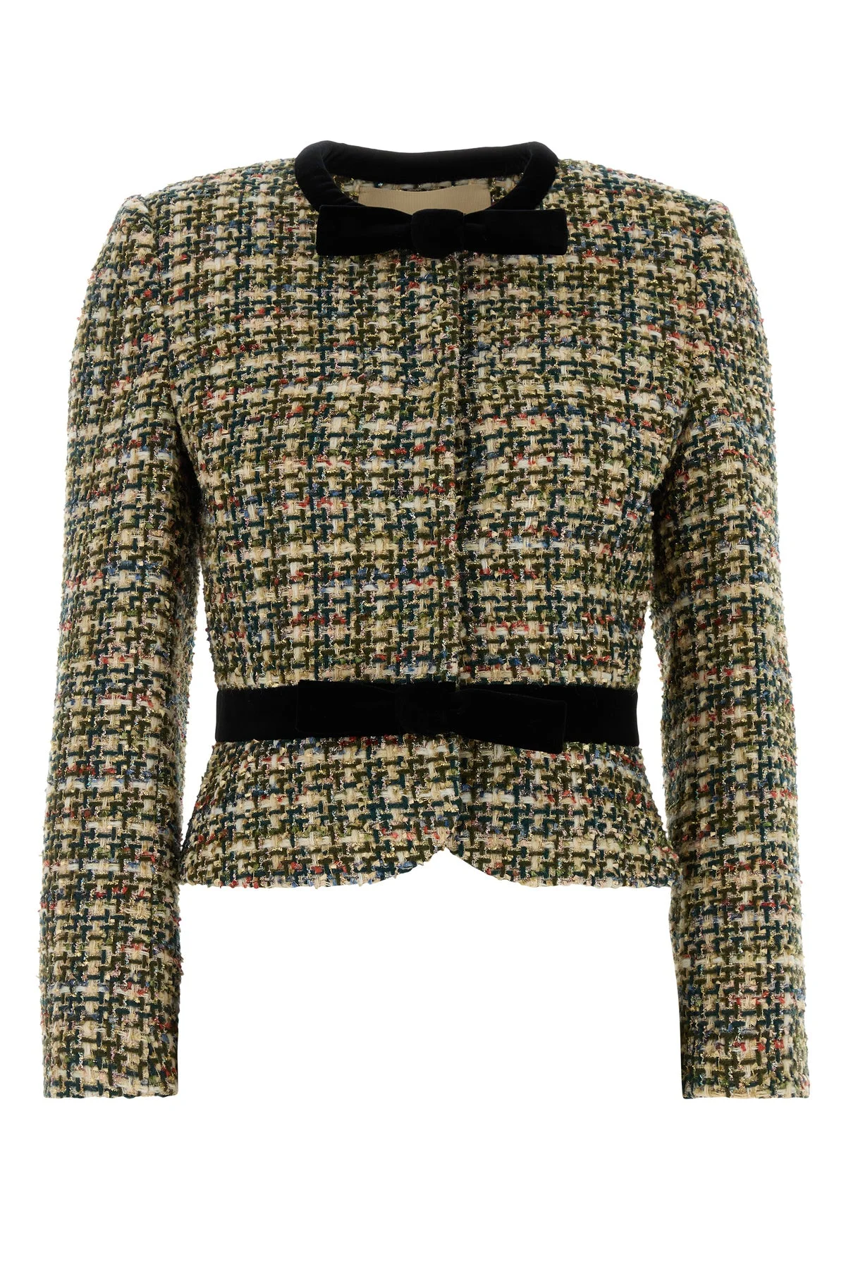 Blazer realized in tweed with lurex threads enriched by velvet decorative bows at the front. - Round neckline - Concealed buttons closure - Two chest pockets - Buttoned cuffs - Lined DETAILS Multicolor tweed blazer Exterior: 36% Wool 36% Acrylic 22% Nylon 6% Metal fiber Lining: 100% Viscose Made in italy Model is 178 cm and is wearing a size 40