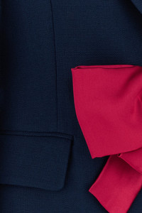 Blazer realized in viscose enriched by decorative bow at the front. - Peak lapels - Peculiar closure by button - A chest pocket and two flap pockets at the front - Four buttons on the sleeves - Lined interior with a flap pocket DETAILS Navy blue viscose blazer Exterior: 100% Viscose Lining: 75% Acetate 25% Silk Made in italy Sample size: 38