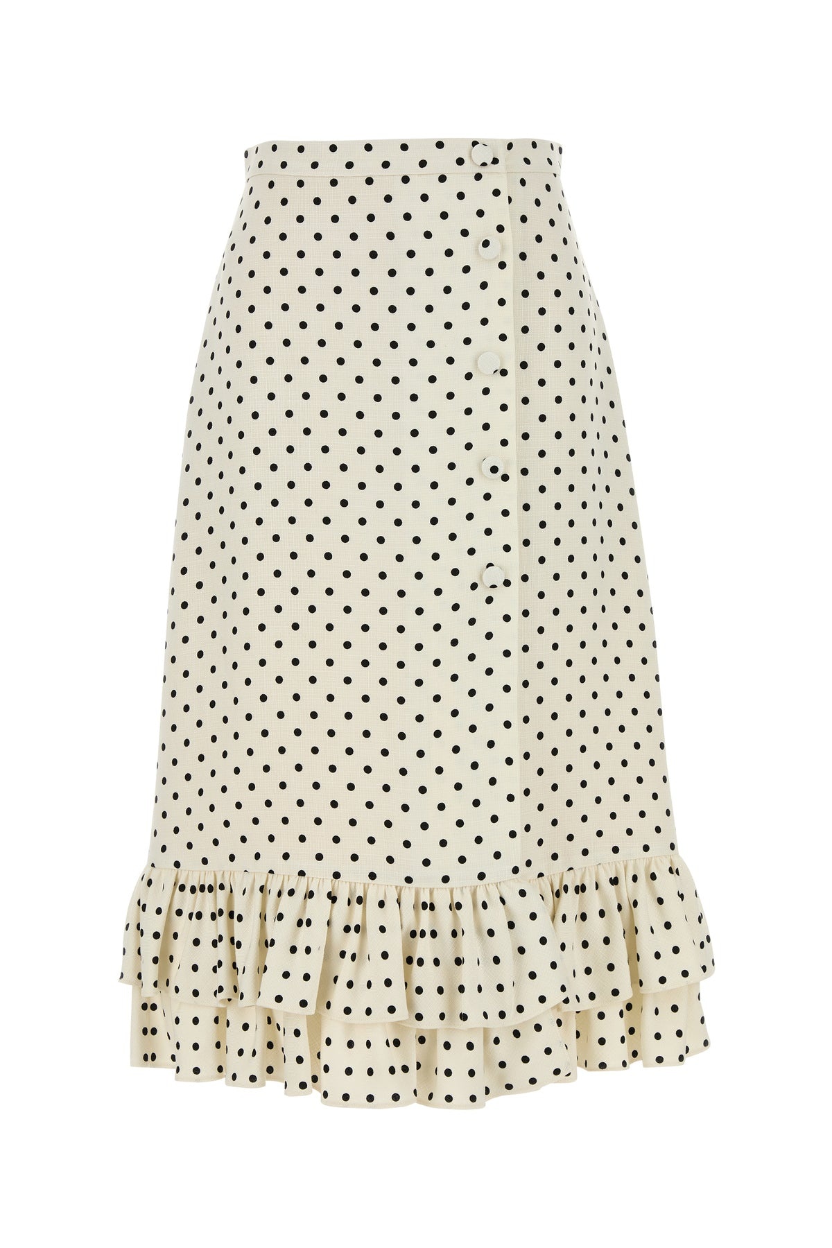 Skirt realized in viscose characterized by polkadot motif embroidery on the entire surface. - Buttons closure - Flounces - Unlined DETAILS Printed viscose skirt Exterior: 100% Viscose Lining: 100% Viscose Made in italy Sample size: 40