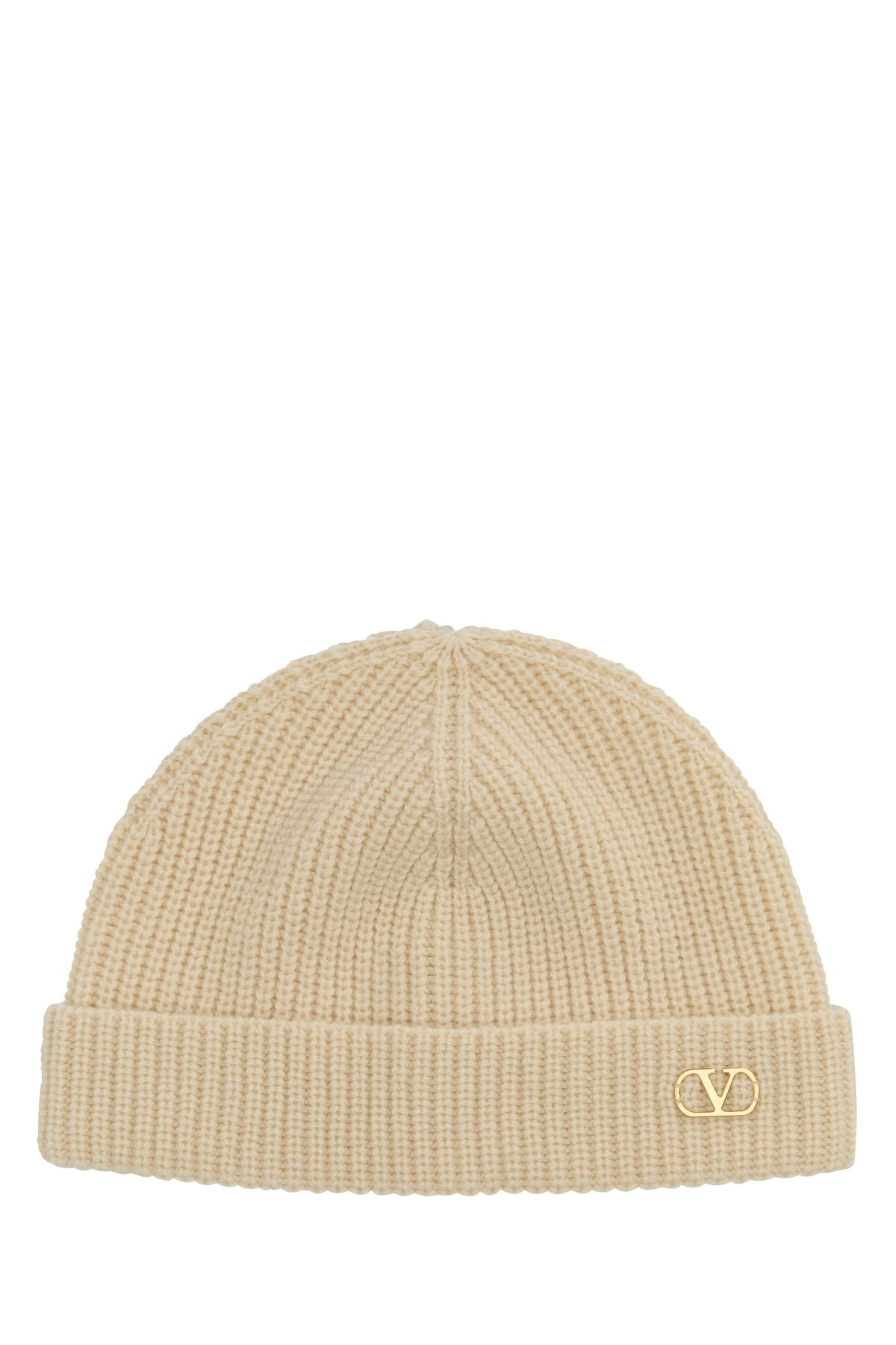 Beanie hat realized in ribbed pure cashmere enriched by metal VLogo detail at the front. - Foldable hemline - Unlined DETAILS Sand cashmere beanie hat Exterior: 100% Cashmere Made in italy