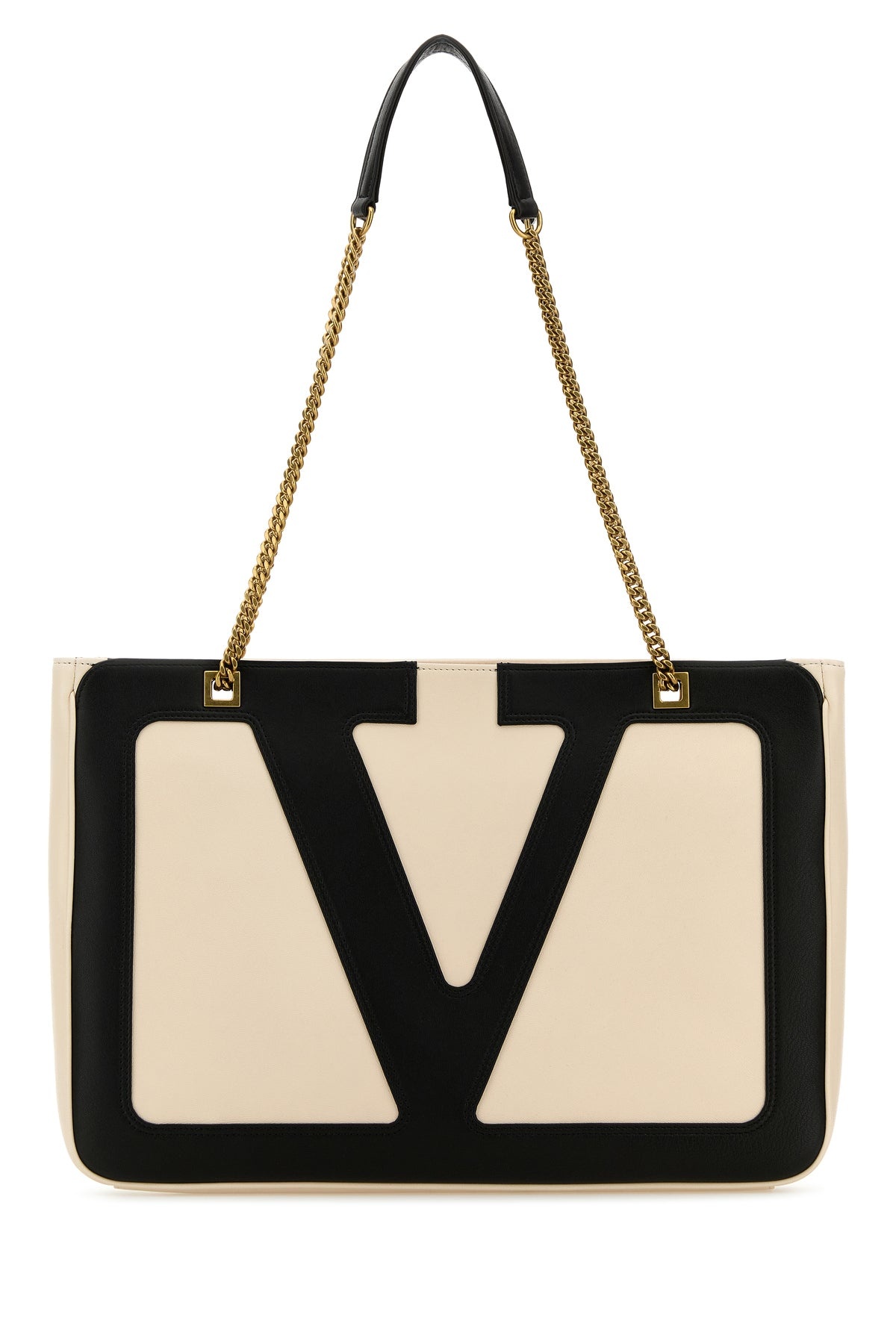 Shopping bag realized in slightly pebble leather enriched by contrasting VLogo Signature patch at the front. - Two metal chain shoulder straps - Zip closure - Lined DETAILS Sand leather medium Viva Superstar shopping bag Exterior: 100% Leather Lining: 100% Leather Finishing: Antiqued golden metal Made in italy Width: 35 cm Height: 26 cm Depth: 4 cm Handle height: 28 cm