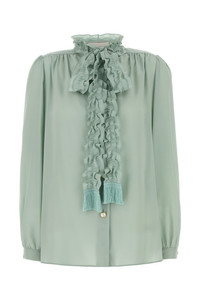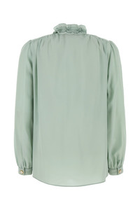 Shirt realized in pure silk crepe characterized by ruffles at the front. - Round neckline - Buttons closure - Angle cuffs with button DETAILS Tiffany crepe shirt Exterior: 100% Silk Made in italy Sample size: 40