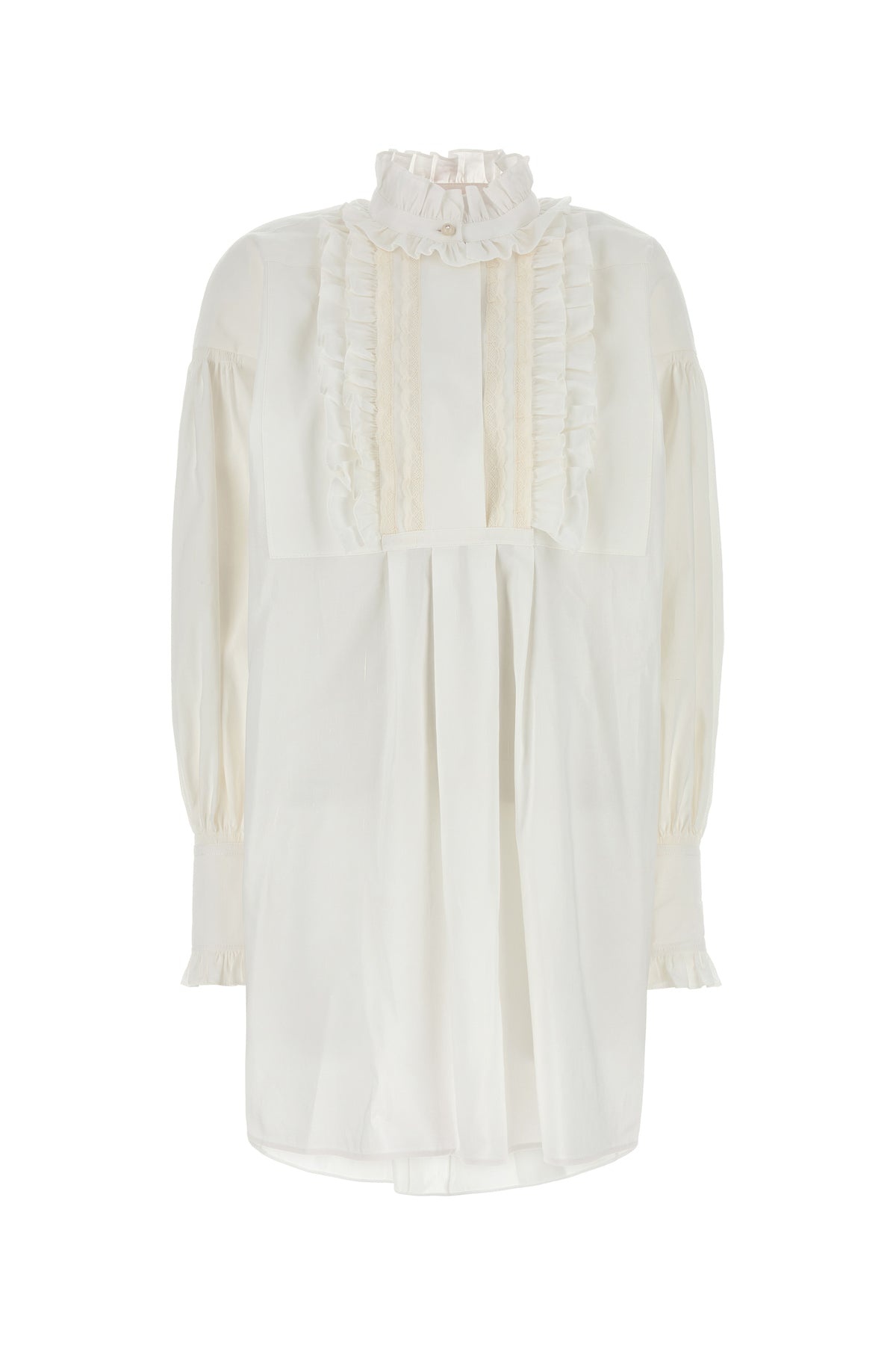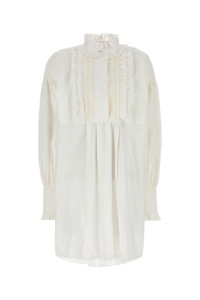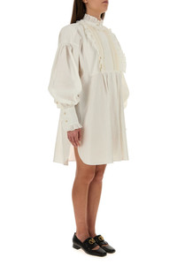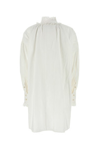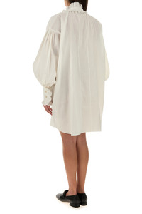 Dress realized in cotton blend characterized by flounces at the front, on the crew-neck and on the cuffs. - Partial buttons closure - Buttoned cuffs - Lateral slits on the hemline - Flared hemline - Unlined DETAILS White cotton blend dress Exterior: 53% Cotton 43% Linen 2% Silk Made in italy Model is 170 cm and is wearing a size 40