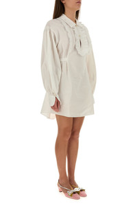 Shirt dress realized in cotton blend characterized by peculiar tonal embroideries on the short-pointed collar and on the buttoned cuffs. - Partial buttons closure - Laces to tie at the back - Slightly flared hemline - Slightly longer back - Unlined DETAILS White cotton blend shirt dress Exterior: 55% Cotton 43% Linen 2% Silk Made in italy Model is 170 cm and is wearing a size 40