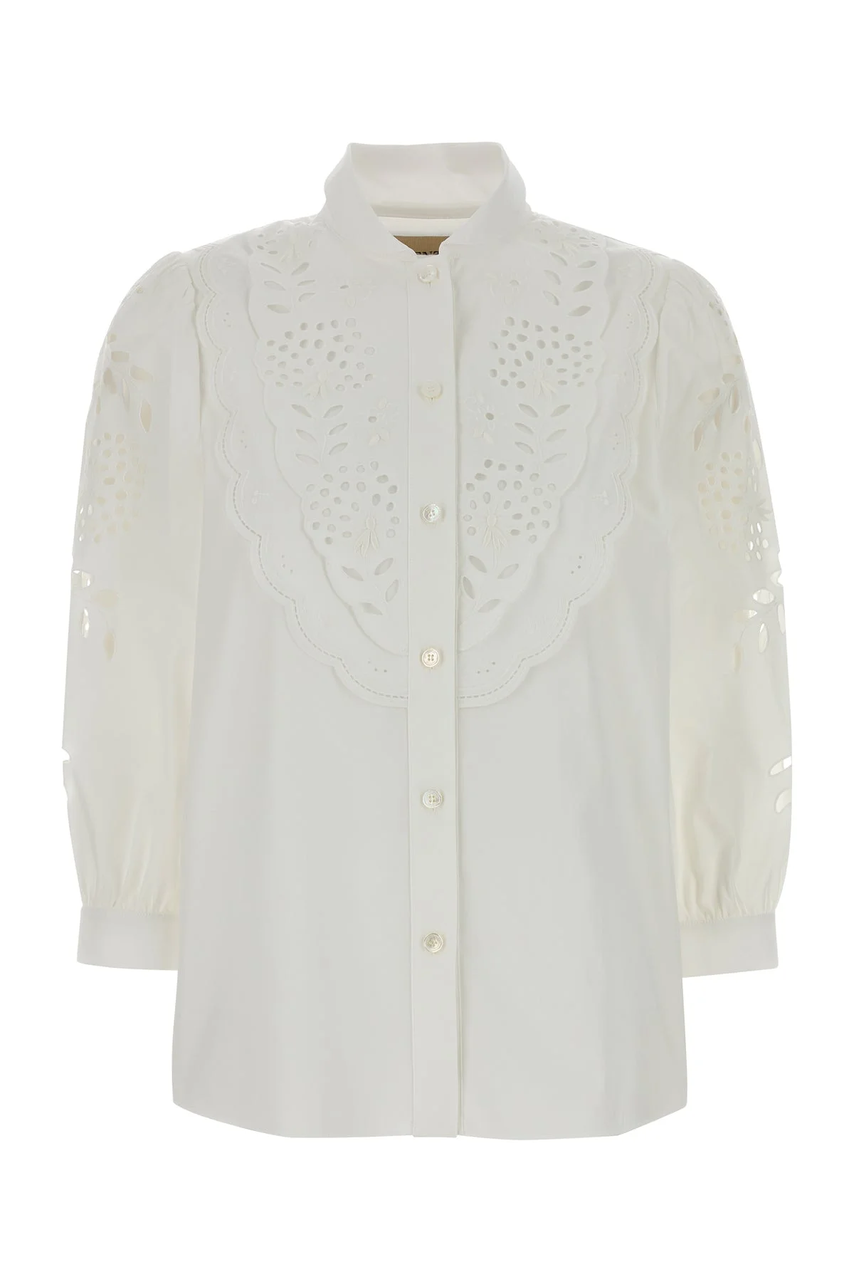 Shirt realized in pure cotton poplin characterized by broderie anglaise insert at the front and on the sleeves. - Rounded collar - Buttons closure - Three-quarter sleeves - Angle cuffs with buttons - Rear yoke and placket DETAILS White poplin shirt Exterior: 100% Cotton Made in italy Sample size: 40