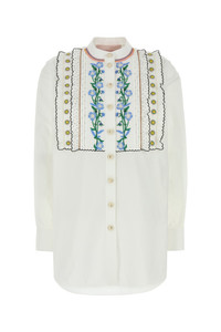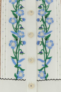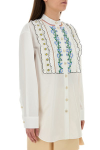 Shirt realized in pure cotton poplin characterized by peculiar floral embroideries with beads at the front. - Mandarin collar - Buttons closure - Buttoned angle cuffs - Rear yoke and rear placket DETAILS White poplin shirt Exterior: 100% Cotton Made in italy Model is 170 cm and is wearing a size 40