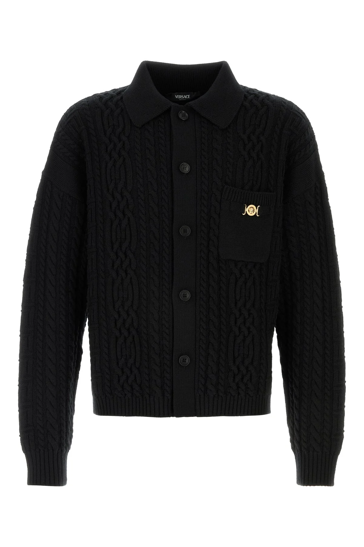 Knitted cardigan realized in pure virgin wool enriched by Medusa metal detail on the chest. - Collar - Buttons closure - Ribbed cuffs and hemline - Lateral slits on the hemline DETAILS Black cardigan wool Exterior: 100% Virgin wool Made in italy Sample size: 50