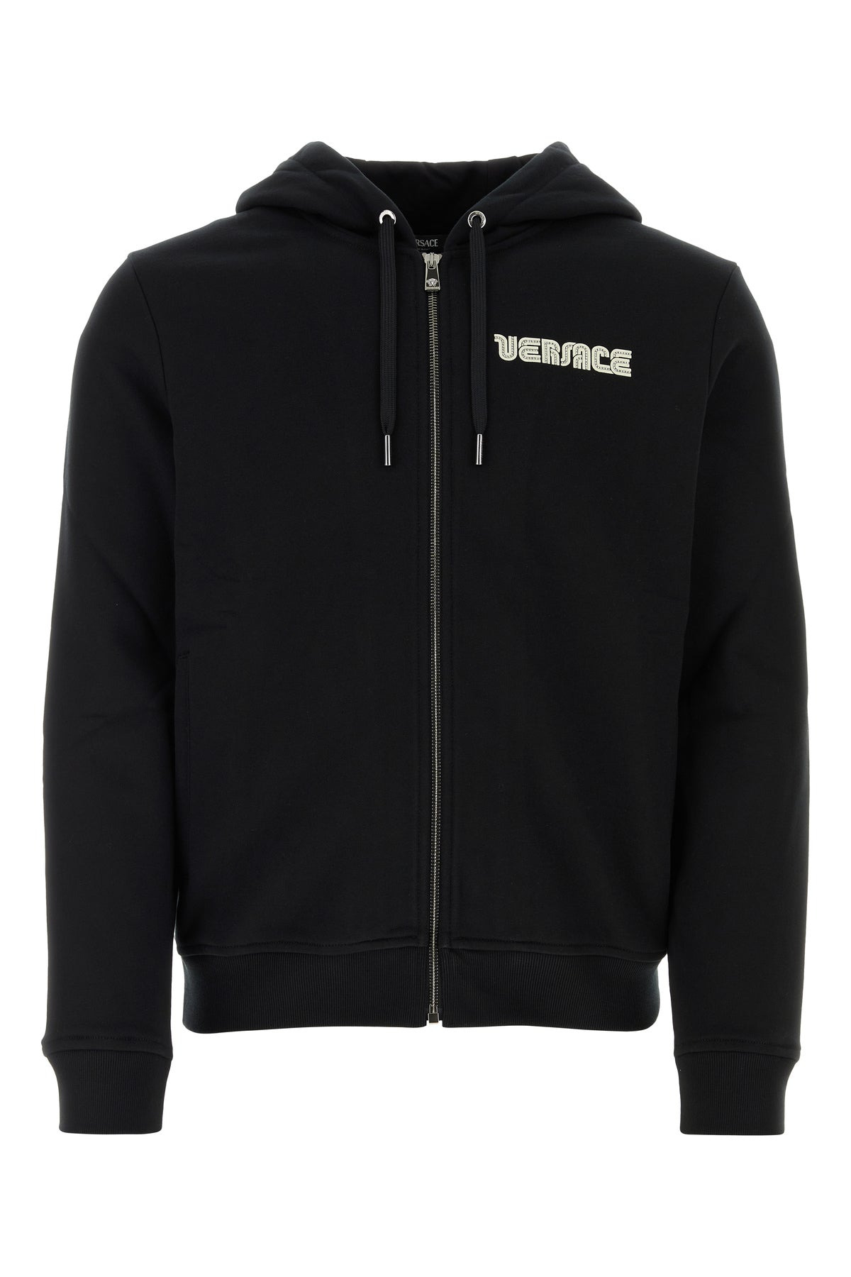 Sweatshirt realized in pure cotton characterized by contrasting logoed print with rhinestones on the chest and at the back. - Drawstring hood - Zip closure - Two slit pockets at the front - Ribbed cuffs and hemline DETAILS Exterior: 100% Cotton Made In Italy Sample size: M