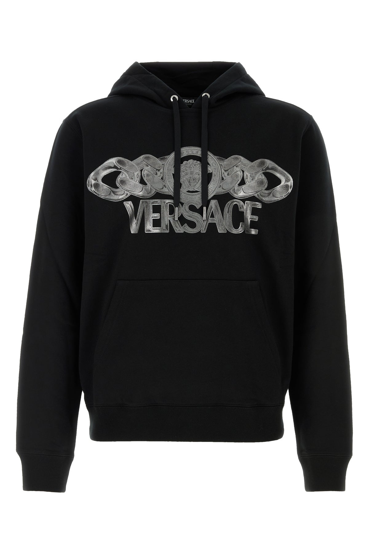 Sweatshirt realized in pure cotton characterized by laminated Medusa on Chain print on the chest. - Drawstring hood - Pouch pocket - Ribbed cuffs and hemline DETAILS Black cotton sweatshirt Exterior: 100% Cotton Made in italy Model is 190 cm and is wearing a size M