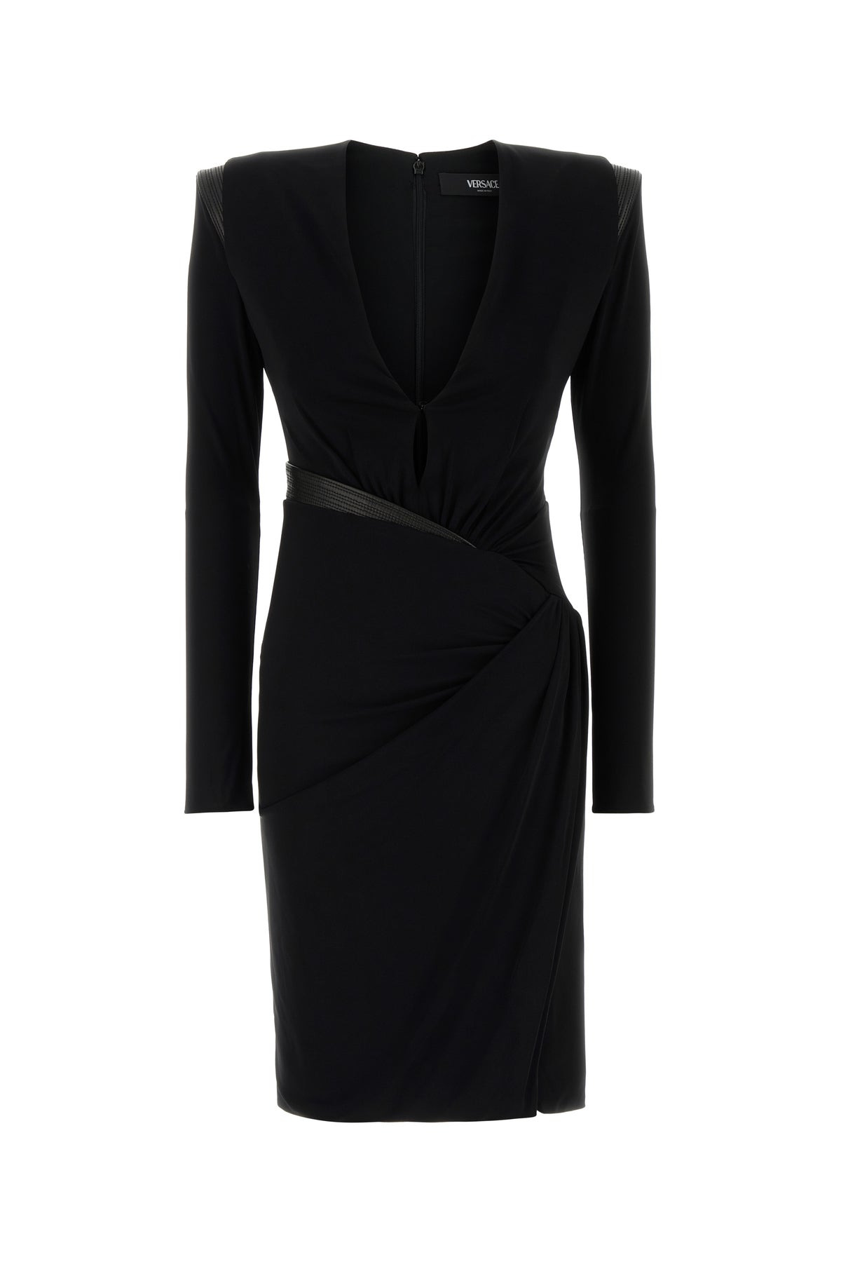 Midi-length dress realized in crepe with tonal leather inserts characterized by drape at the front. - Deep V neckline - Padded shoulders - Concealed zip closure at the back - Lined DETAILS Black crepe dress Exterior: 95% Viscose 5% Elastane Lining: 95% Viscose 5% Elastane Made in italy Sample size: 38