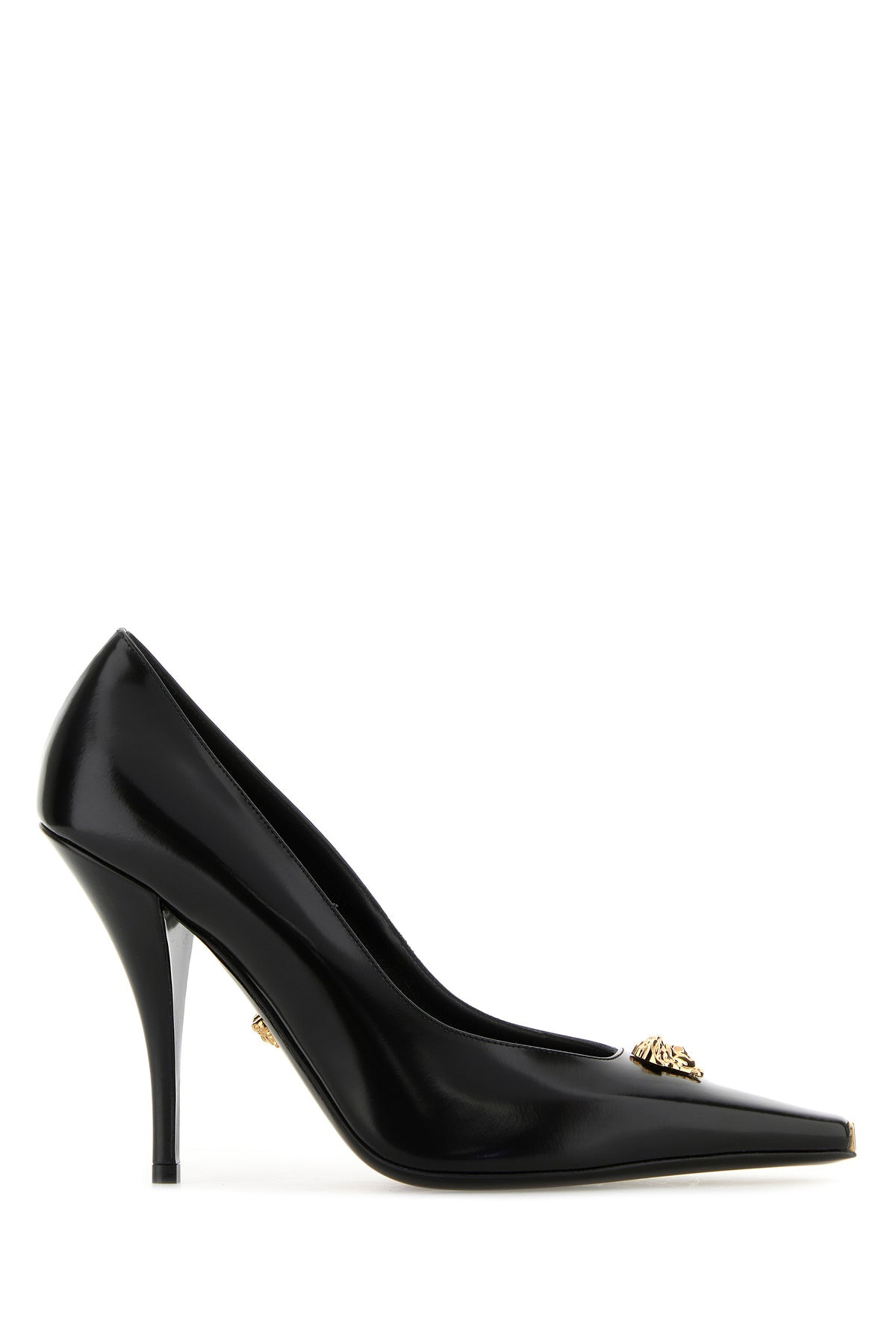 Pumps realized in polished finish leather enriched by Medusa metal detail on the instep and logoed metal plate on the pointed-cut tOE. - Stiletto heel - Printed logo on the inside DETAILS Black leather pumps Exterior: 100% Leather Interior: 100% Leather Sole: Leather Made in italy Heel height: 11 cm