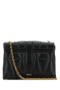 Shoulder bag realized in quilted lamb nappa leather enriched by metal Medusa '95 detail at the front. - Metal chain shoulder strap that can be worn single or double - Magnetic button closure - Lined interior with a patch pocket and three compartments DETAILS Black nappa leather Kleio shoulder bag Exterior: 100% Lamb Lining: 100% Fabric Finishing: Golden metal Made in italy Width: 22 cm Height: 16,5 cm Depth: 9 cm Min shoulder strap length: 31 cm Max shoulder strap length: 50 cm