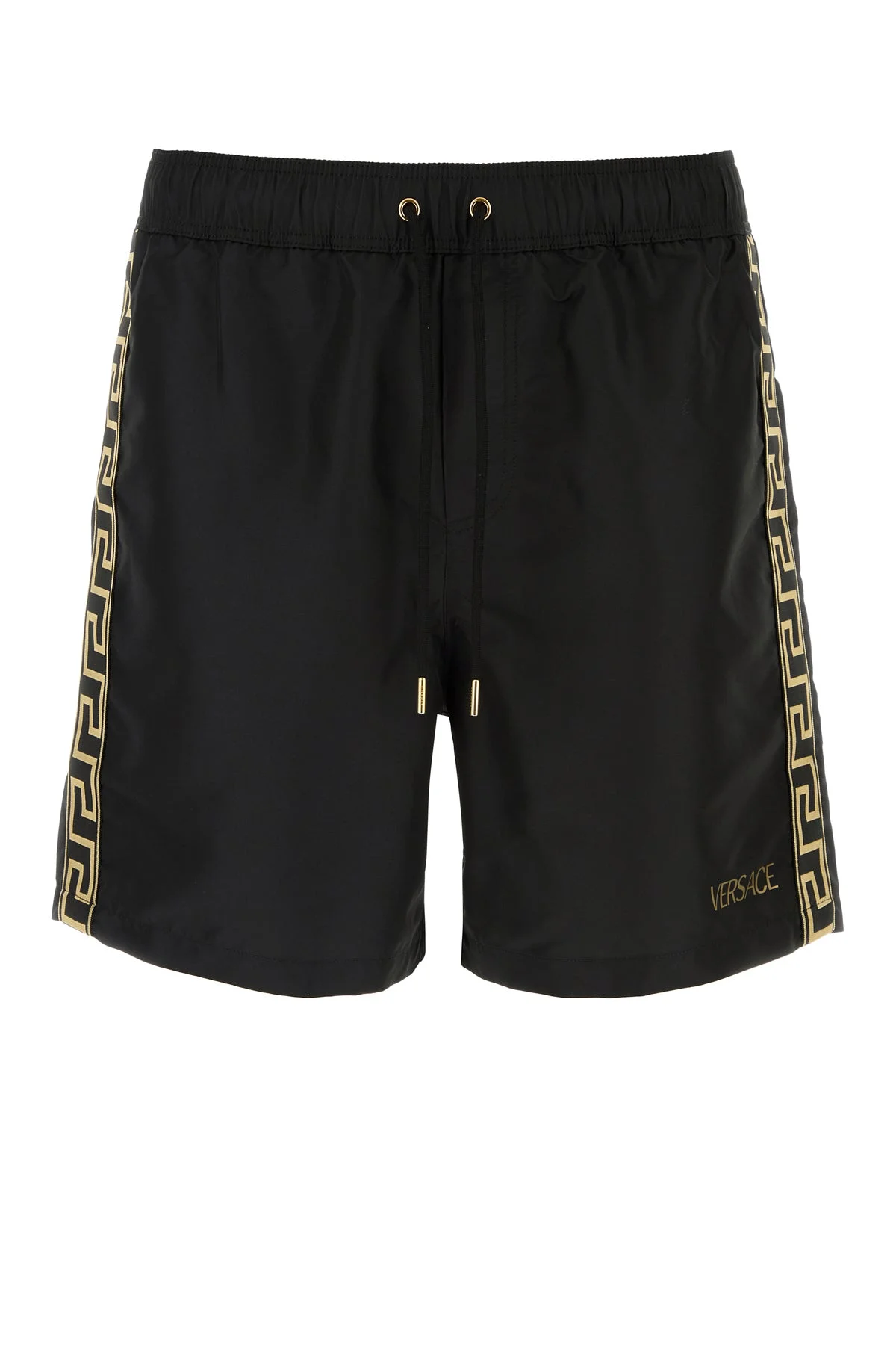 Swimming shorts realized in polyester characterized by Greca embroidery on the sides and printed logo on the hemline. - Elastic waist with drawstring - A patch pocket at the back - Partially lined DETAILS Black polyester swimming shorts Exterior: 100% Polyester Lining: 80% Polyester 10% Nylon 10% Elastane Made in italy Sample size: IV