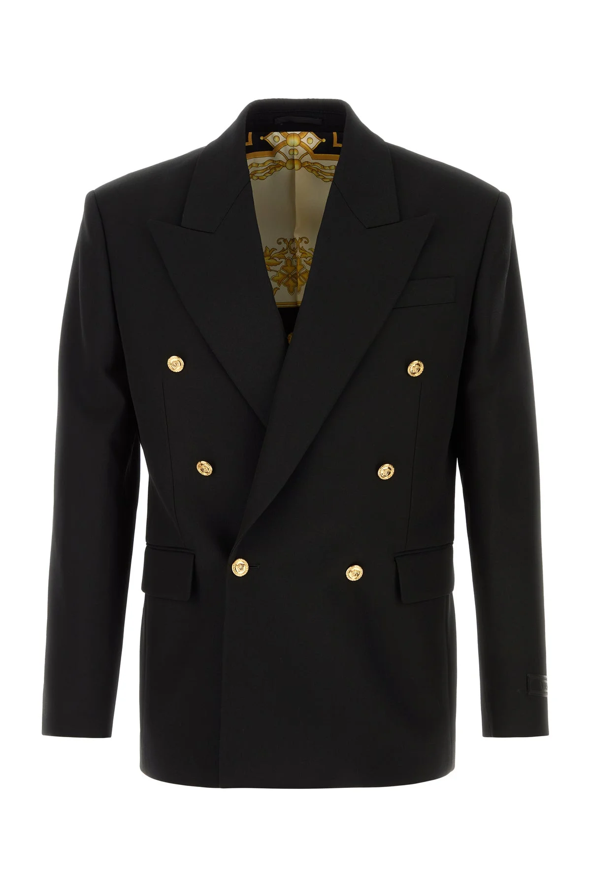 Blazer realized in pure virgin wool enriched by iconic Medusa Head buttons and logoed label on the cuff. - Peak lapels - Padded shoulders - Double-breasted closure by buttons - Chest pocket and two flap pockets at the front - Buttoned cuffs - Central slit at the back - Lined interior with two slit pockets DETAILS Black wool blazer Exterior: 100% Virgin wool Lining: 100% Cupro Made in italy Model is 190 cm and is wearing a size 48