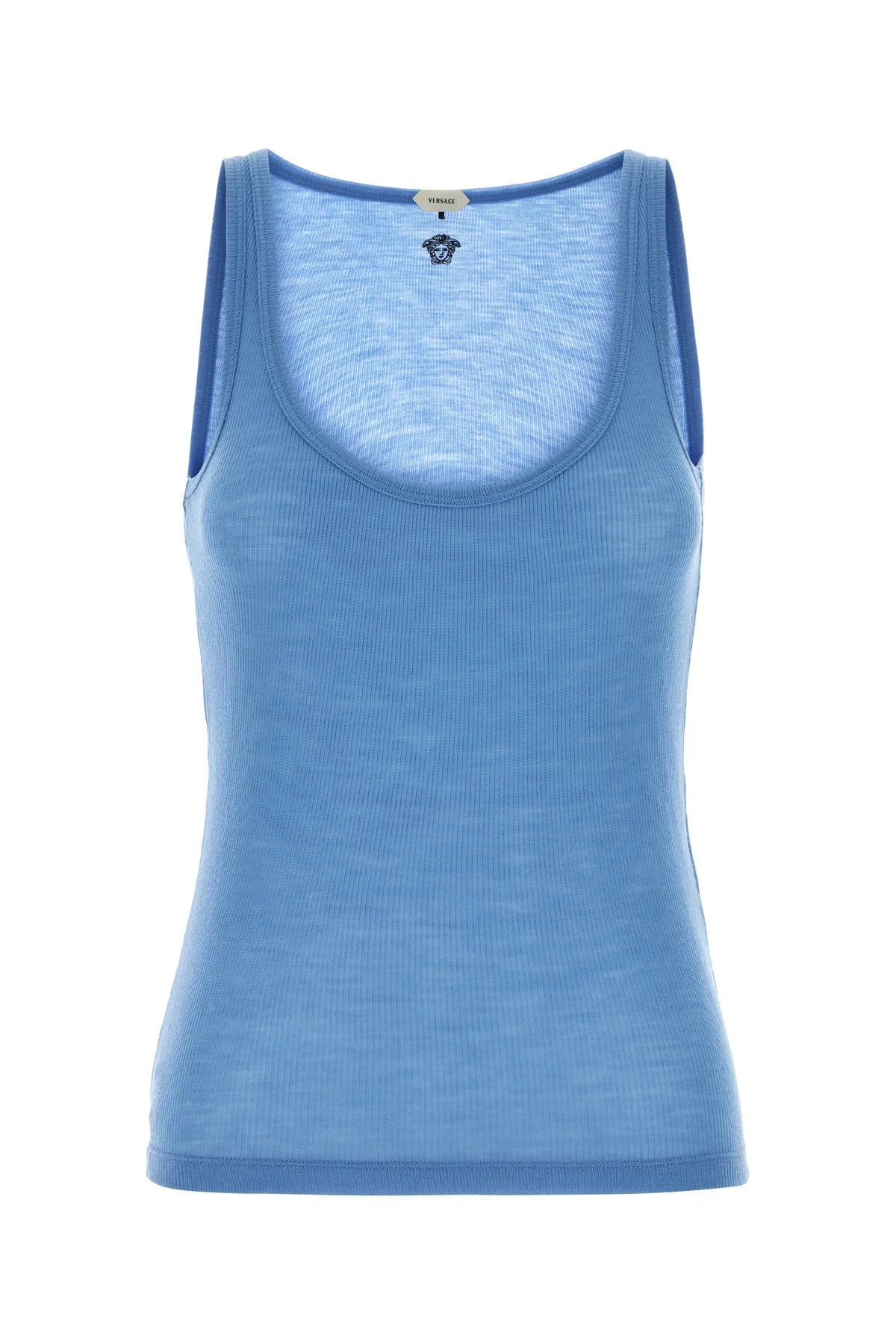 Tank top realized in pure virgin wool characterized by Medusa embroidery at the back. - Round neckline DETAILS Cerulean blue wool tank top Exterior: 100% Virgin wool Made in italy Sample size: 38