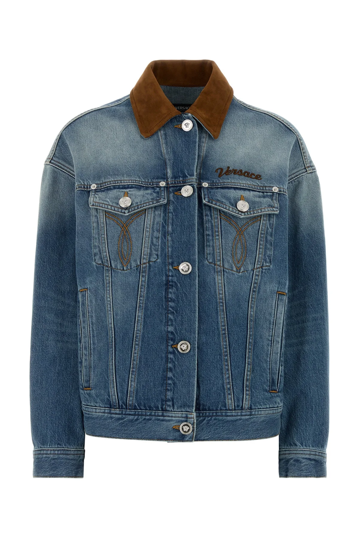 Jacket realized in stonewashed pure cotton denim enriched by suede Versace Logo patch on the chest. - Suede collar - Buttons closure - Two flap pockets and tw slit pockets at the frot - Unllined DETAILS Denim jacket Exterior: 100% Cotton Made in italy Sample size: 38