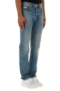 Jeans realized in stonewashed pure cotton denim enriched by Medusa metal detail at the front. - Belt loops at the waist - Concealed zip and single visible button closure - Five classic pockets - Contrasting logoed label at the back DETAILS Denim jeans Exterior: 100% Cotton Made in tunisia Model is 190 cm and is wearing a size 31