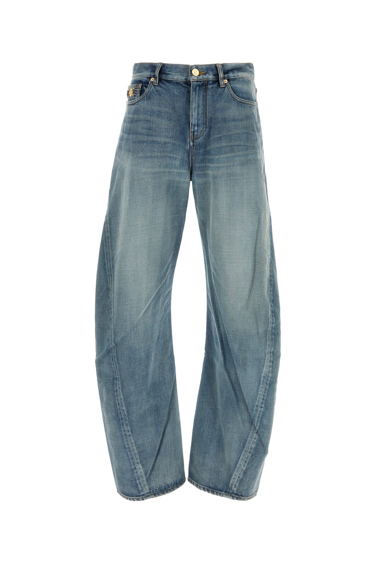 Twisted jeans realized in stonewashed pure cotton denim enriched by metal Medusa Biggie detail at the front. - Belt loops at the waist - Concealed zip and a single visible button closure - Five classic pockets - Leather Versace Logo Made in Japan label at the back DETAILS Denim jeans Exterior: 100% Cotton Made in japan Sample size: 31