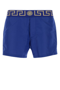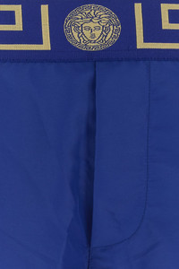Swimming shorts realized in polyester enriched by contrasting logoed band at the waist. - Elastic waist - Seam pockets and a patch pocket at the back - Partially lined DETAILS Electric blue polyester swimming shorts Exterior: 100% Polyester Lining: 94% Nylon 6% Elastane Made in italy Sample size: III