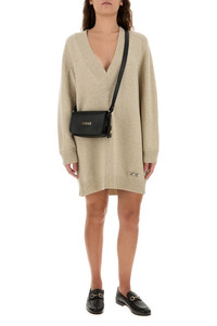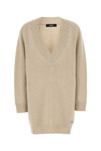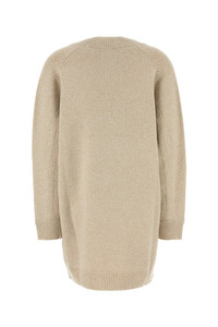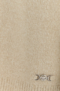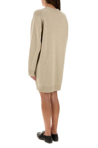 Sweater dress realized in wool and cashmere enriched by Medusa metal detail on the hemline. - V neckline - Ribbed cuffs and hemline - Unlined DETAILS Melange beige wool blend sweater dress Exterior: 70% Wool 30% Cashmere Made in italy Model is 170 cm and is wearing a size 40