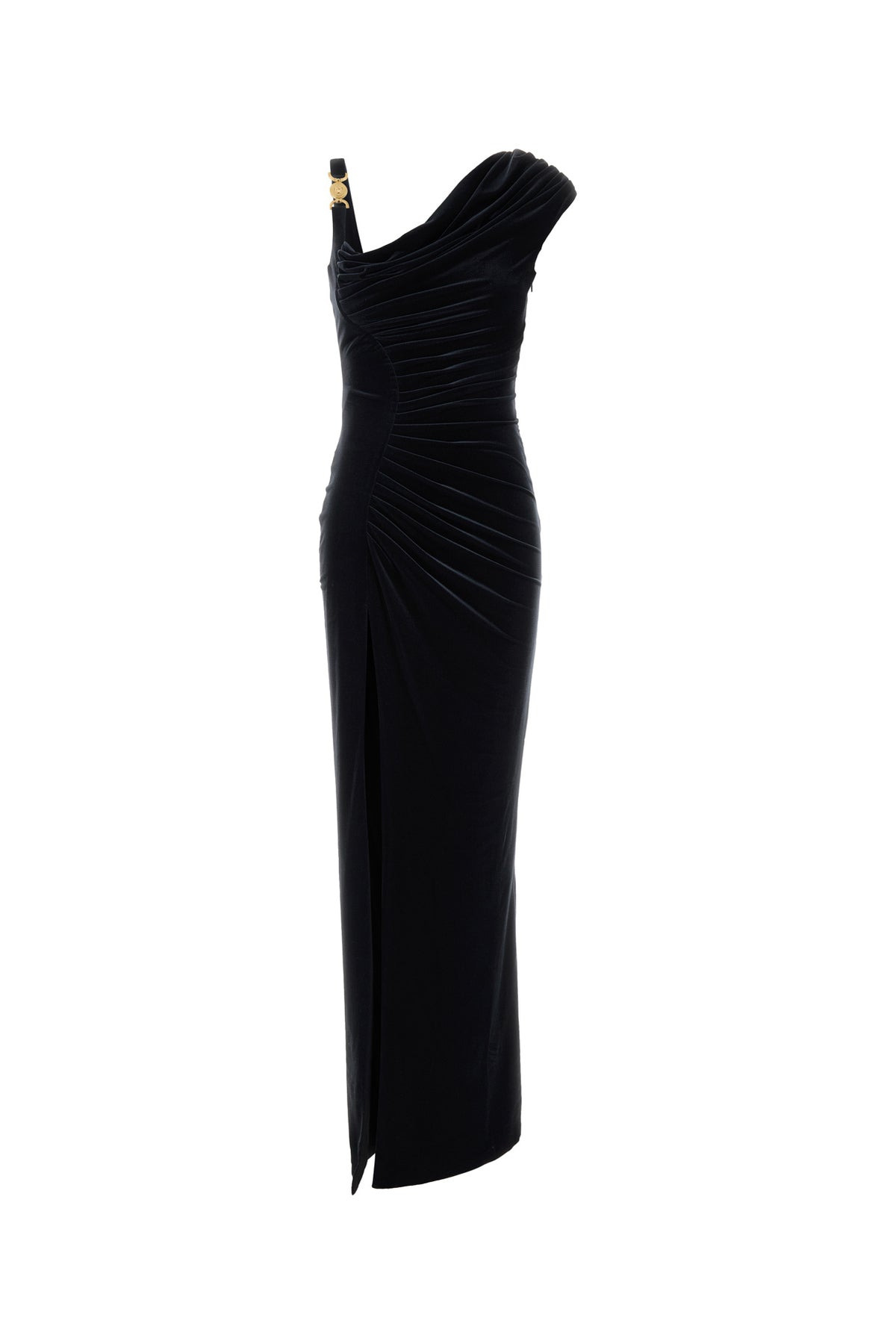 Long fitted dress realized in stretch velvet enriched by Medusa metal detail on the shoulder strap. - Peculiar neckline - Concealed zip closure on the side - Gathering ont he side - Lateral slits on the hemline - Lined DETAILS Midnight blue stretch velvet long dress Exterior: 85% Nylon 15% Elastane Lining: 100% Viscose Made in italy Sample size: 38