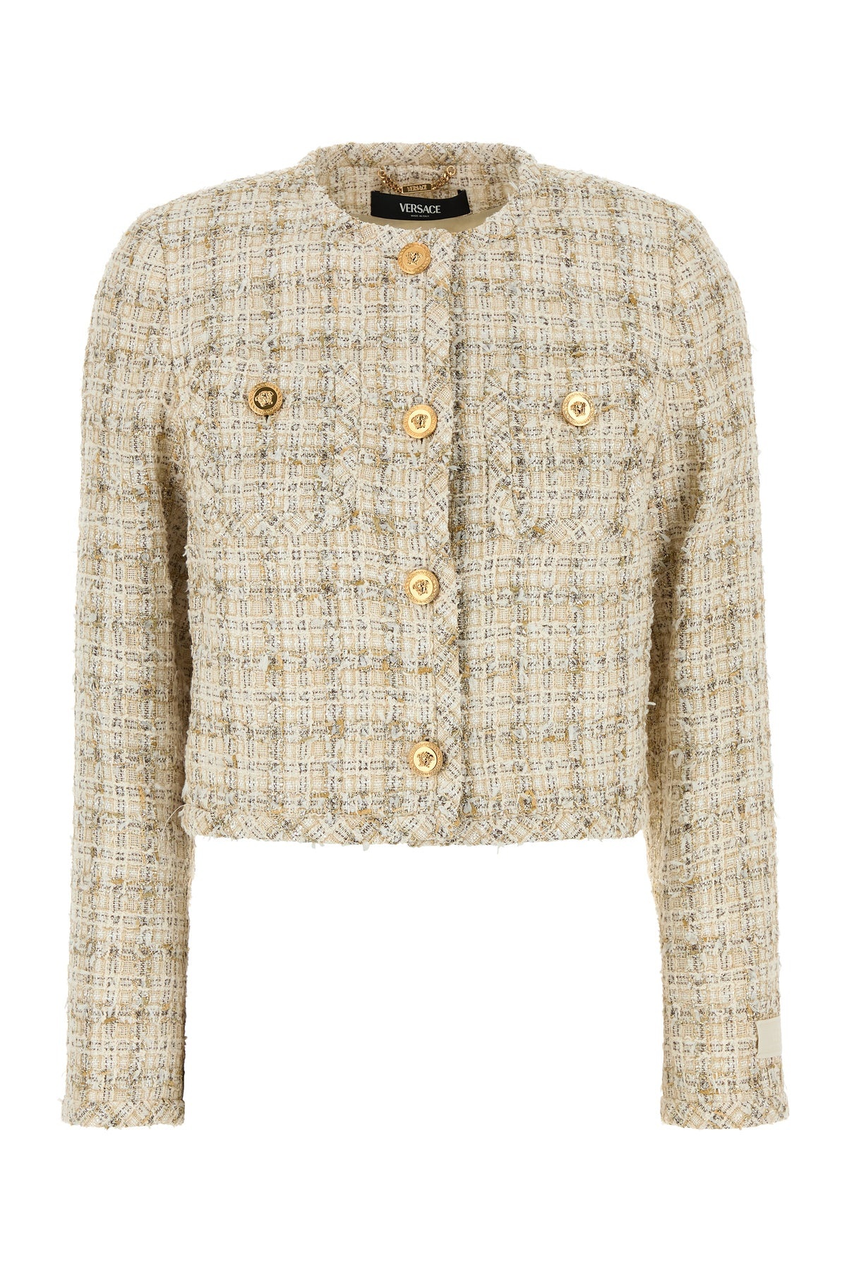 Blazer realized in tweed with lurex threads. - Crew-neck - Buttons closure - Two chest pockets - Logoed label on the cuff - Lined DETAILS Multicolor tweed blazer Exterior: 64% Cotton 14% Viscose 6% Polyester 4% Metallized polyester 2% Acrylic Lining: 100% Cupro Made in italy Sample size: 40