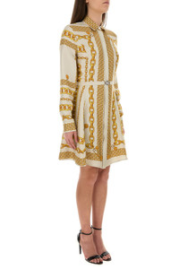 Dress realized in pure silk characterized by Versace Treasure print on the entire surface enriched by detachable belt with metal iconic Medusa Head buckle. - Pointed collar - Concealed buttons closure - Buttoned cuffs - Unlined DETAILS Printed silk dress Exterior: 100% Cotton Made in italy Model is 170 cm and is wearing a size 40