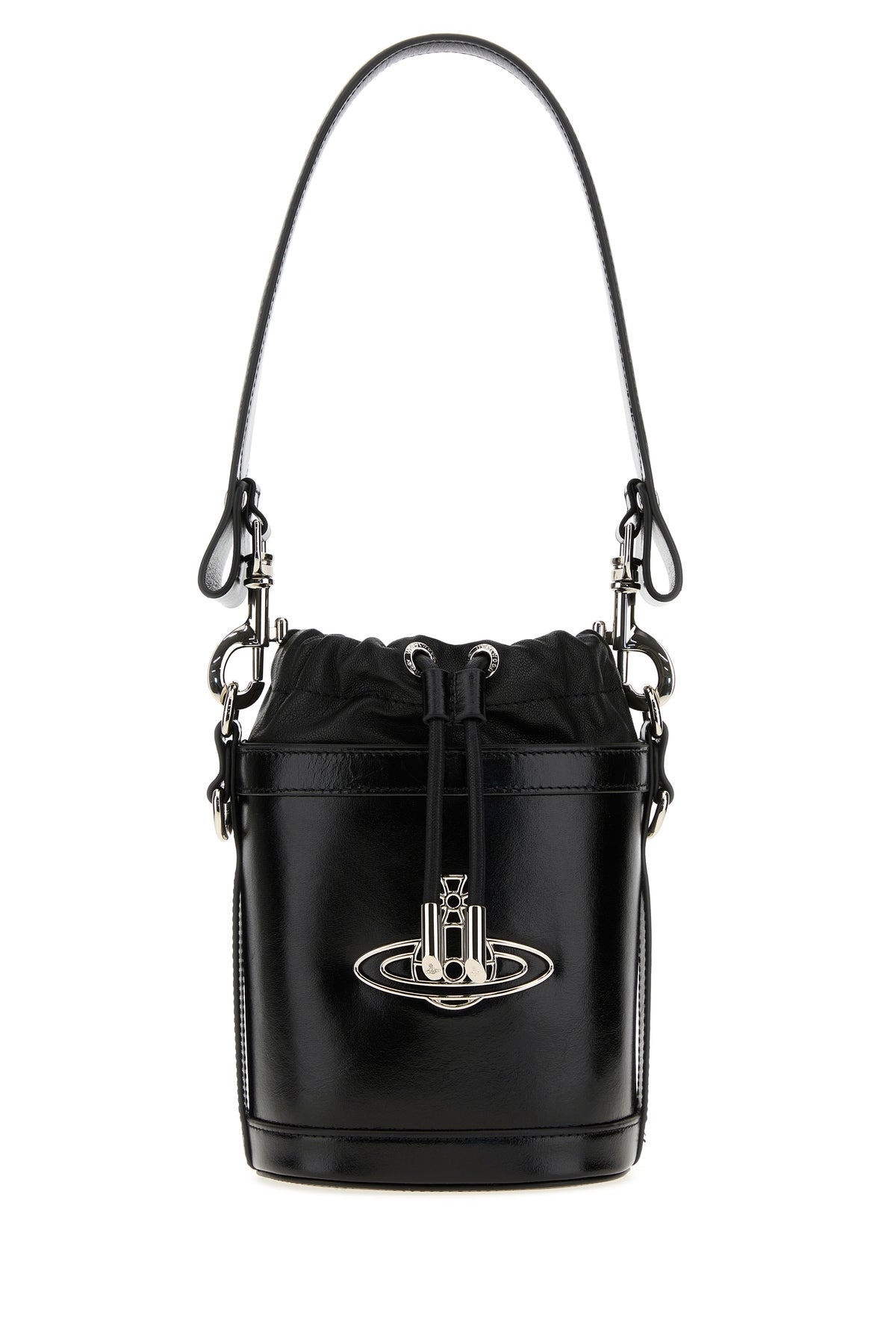 Bucket bag realized in nappa leather enriched by Orb metal detail at the front. - A tonal leather flat handle - Detachable metal chain shoulder strap - Drawstrings closure - Lined DETAILS Black nappa leather small Kitty bucket bag Exterior: 100% Nappa leather Lining: 100% Fabric Finishing: Silver metal Made in Larghezza: 14 cm Altezza: 16 cm Profondita: 11 cm Altezza manico: 21 cm Lunghezza tracolla: 50 cm