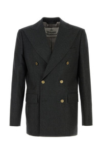Blazer realized in wool blend with lurex threads characterized by peak lapels. - Double-breasted closure by buttons - A chest pocket and two flap pockets at the front - Four buttons on the sleeves - Lateral slits at the back - Lind interior with a slit pocket DETAILS Charcoal wool blend Captain blazer Exterior: 98% Wool 1% Nylon 1% Metal fiber Lining: 100% Viscose Made in italy Sample size: 48