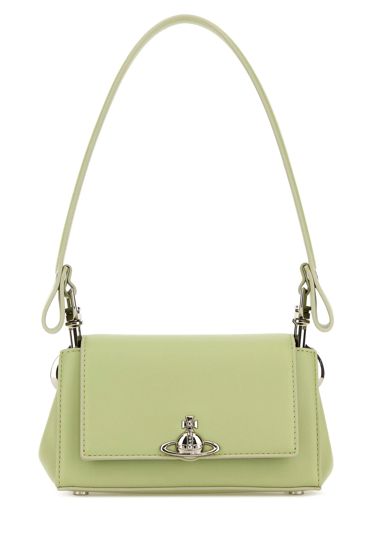 Shoulder bag realized in synthetic leather enriched by Orb metal detail at the front. - A detachable flat handle - Adjustable metal chain shoulder strap - Magnetic button closure under the flap - Lined - Protective metal feet at the base DETAILS Pastel green synthetic leather small Hazel shoulder bag Exterior: 55% Polyurethane 45% Polyester Lining: 100% Fabric Finishing: Silver metal Made in Width: 26 cm Height: 15 cm Depth: 11,5 cm Handle height: 20 cm Shoulder strap length: 50 cm