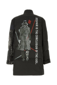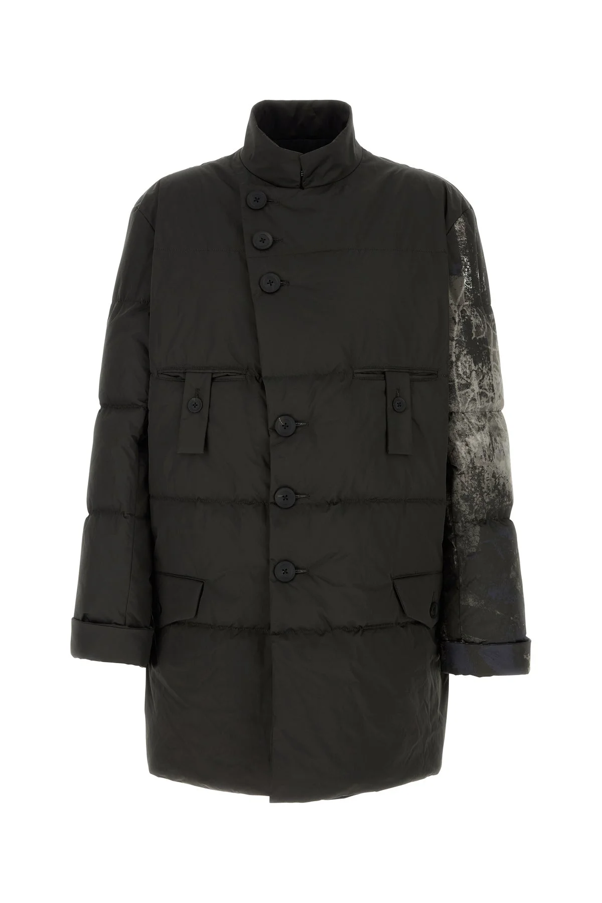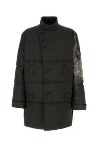 Padded jacket realized in quilted polyester characterized by peculiar print on the sleeve. - High collar - Buttons closure - Two slit pockets and two flap pockets at the front - Straps on the cuffs - Lined interior with two slit pockets DETAILS Dark brown polyester padded jacket Exterior: 100% Polyester Lining: 100% Cupro Padding: 100% Polyester Made in japan Sample size: 4