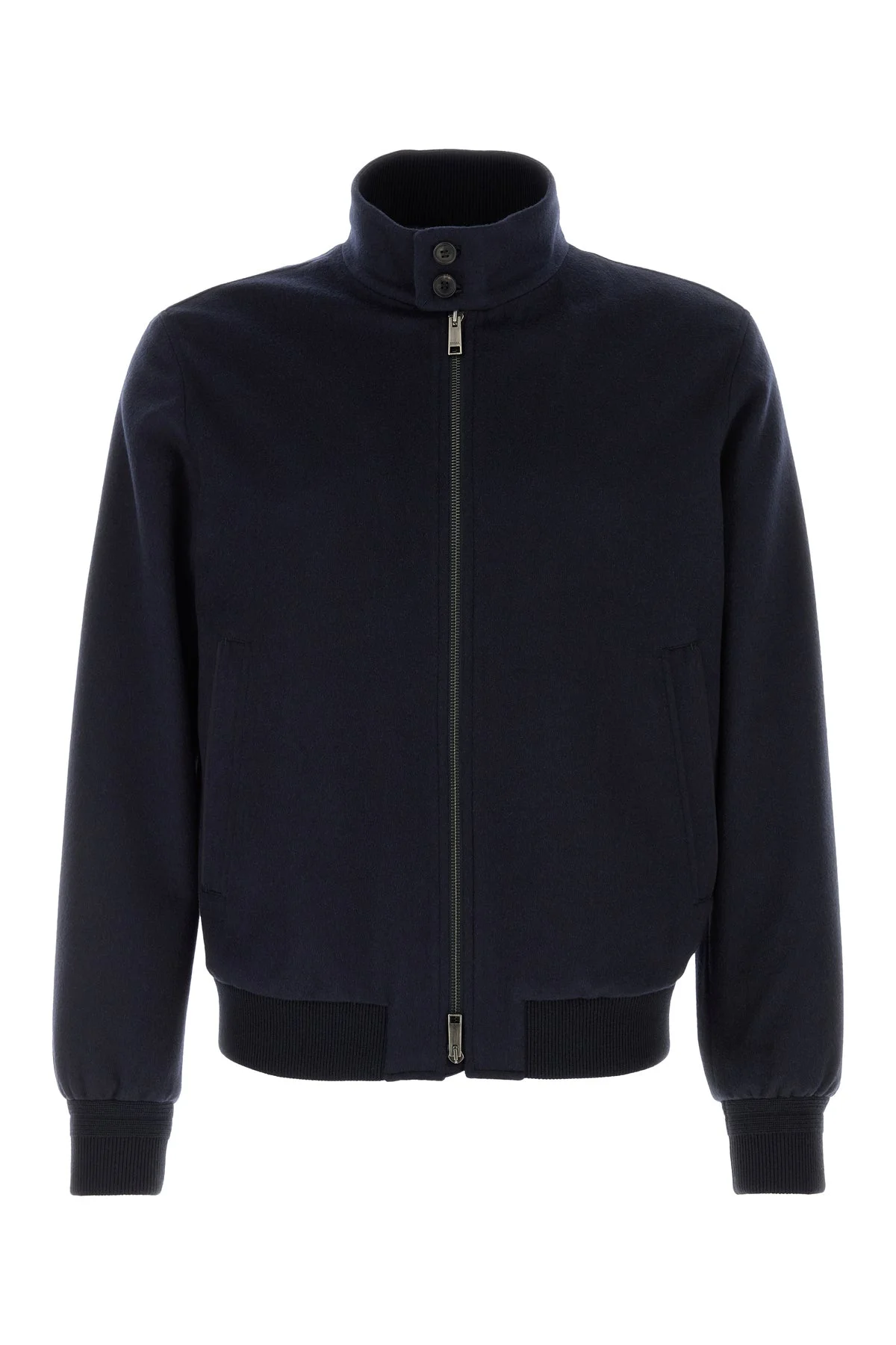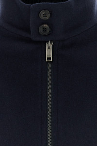 Jacket realized in pure cashmere enriched by high collar. - Zip closure - Two slit pockets at the front - Ribbed cuffs and hemline - Lined interior with a patch pocket DETAILS Dark blue cashmere jacket Exterior: 100% Cashmere Lining: 89% Wool 6% Silk 5% Cashmere Made in italy Sample size: 48