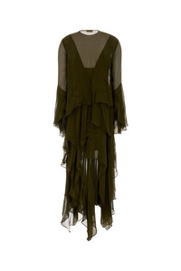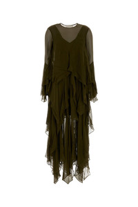 Dress realized in pure silk crepe characterized by flounces on the entire surface. - Round neckline - Concealed zip closure at the top - Asymmetric hemline - Petticoat included DETAILS Army green crepe Memento dress Exterior: 100% Silk Lining: 100% Viscose Made in china Sample size: 1