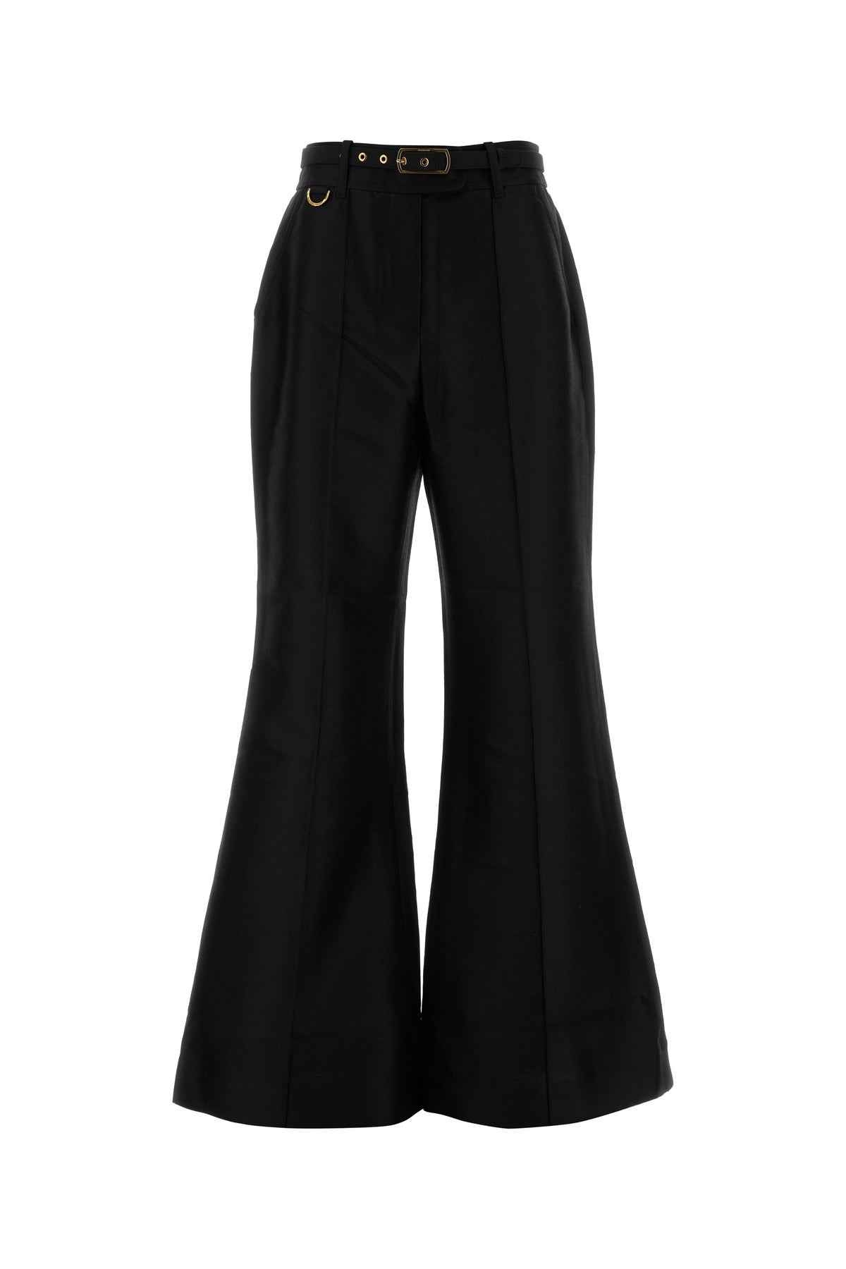 Flared pant realized in wool and silk enriched by detachable belt with metal logoed buckle. - Belt loops at the waist - Concealed zip and hooks closure - Slant pockets and two flap pockets at the back - Central seamed pleats DETAILS Black wool blend Hypnotic flared pant Exterior: 92% Wool 8% Silk Made in china Sample size: 1