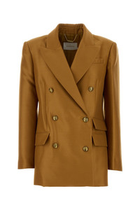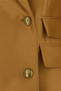 Blazer realized in wool and silk. - Peak lapels - Padded shoulders - Double-breasted closure by buttons - Chest pocket and two flap pockets at the front - Buttoned cuffs - Lateral slits at the back - Lined DETAILS Caramel wool blend Hypnotic blazer Exterior: 92% Wool 8% Silk Lining: 75% Viscose 25% Silk Made in china Sample size: 1