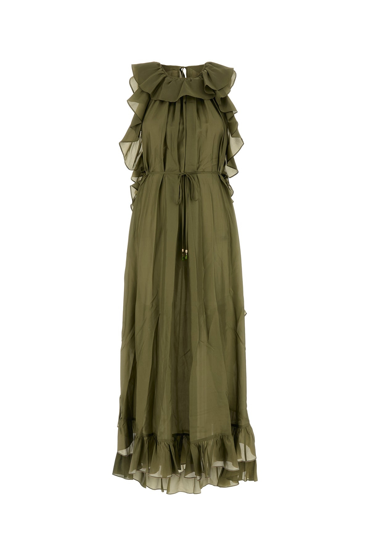 Dress realized in pure silk characterized by flounces on the sides and on the hemline. - Crew-neck - Laces to tie closure at the back - Backless - Unlined DETAILS Olive green silk Cascadian dress Exterior: 100% Silk Made in china Sample size: 1