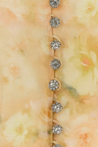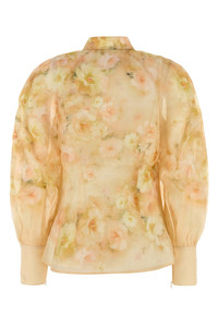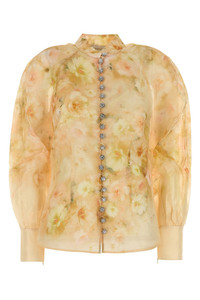 Shirt realized in linen and silk characterized by floral print on the entire surface. - Mandarin collar - Jewel buttons closure - Angle cuffs with zip - Petticoat included DETAILS Printed linen blend Crush shirt Exterior: 55% Linen 45% Silk Lining: 86% Recycled polyester 14% Elastane Made in china Sample size: 1