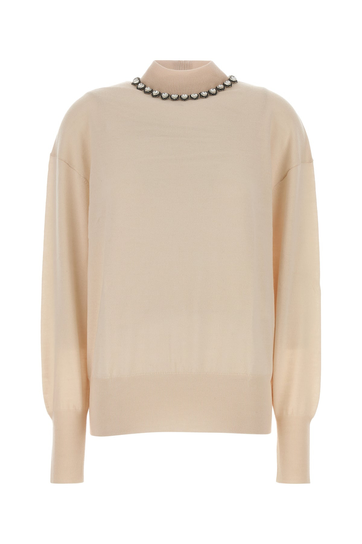 Sweater realized in pure wool enriched by jewel embellishment on the high collar. - Ribbed cuffs and hemline - Concealed zip closure at the back DETAILS Skin pink wool Hypnotic sweater Exterior: 100% Wool Made in china Sample size: 1
