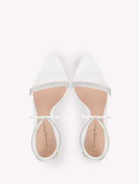 Montecarlo is a pointed-toe sandal, set on an elegant 105mm stiletto heel. Two thin straps embellish the front with tiny precious crystals. The ankle strap shines as well: tiny crystals enrich the bow tie detailed ankle strap. Handcrafted in Italy as in the best artisanal tradition. - Composition: 40%RASO+50%CAMOSCIO+10%NAPPA - Heel Height: 4.1 inches / 105 mm - Model Code: G61408.15RIC Item ID: G61408.15RIC.RMPBIBB