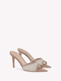 Crafted from see-through silk organza and finished with a suede trim, Rania Mule 85 is a pointed open toe style with an 85mm stiletto heel covered in matching suede. Each pair is enriched with approximately 1450 precious crystals. Handmade in Italy. - Composition: 30% SUEDE + 70% FABRIC - Heel Height: 3.3 inches / 85 mm - Model Code: G15040.85RIC Item ID: G15040.85RIC.COZPRND
