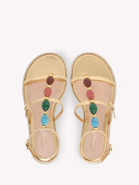 Crafted from metallic-effect leather, Shanti Beach is a round toe gladiator sandal. The flatform sole measures 35mm at the back of the heel. The upper straps are embellished with Chakra-inspired natural cabochon stones and metallic gold studs. The iconic Ribbon buckles enhance fitting adjustments. Handmade in Italy. - Composition: 100% NAPPA - Heel Height: 0.2 inches / 5 mm - Model Code: G32518.05GOM Item ID: G32518.05GOM.NKJMENA